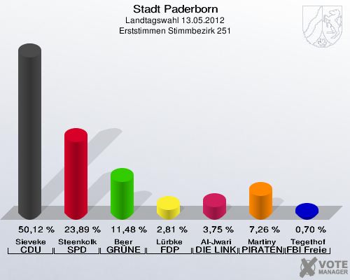 Stadt Paderborn, Landtagswahl 13.05.2012, Erststimmen Stimmbezirk 251: Sieveke CDU: 50,12 %. Steenkolk SPD: 23,89 %. Beer GRÜNE: 11,48 %. Lürbke FDP: 2,81 %. Al-Jwari DIE LINKE: 3,75 %. Martiny PIRATEN: 7,26 %. Tegethof FBI Freie Wähler: 0,70 %. http://www.votemanager.de