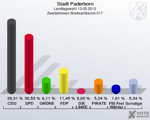 Stadt Paderborn, Landtagswahl 13.05.2012, Zweitstimmen Briefwahlbezirk 017: CDU: 39,31 %. SPD: 30,53 %. GRÜNE: 6,11 %. FDP: 11,45 %. DIE LINKE: 0,00 %. PIRATEN: 5,34 %. FBI Freie Wähler: 1,91 %. Sonstige: 5,34 %. http://www.votemanager.de